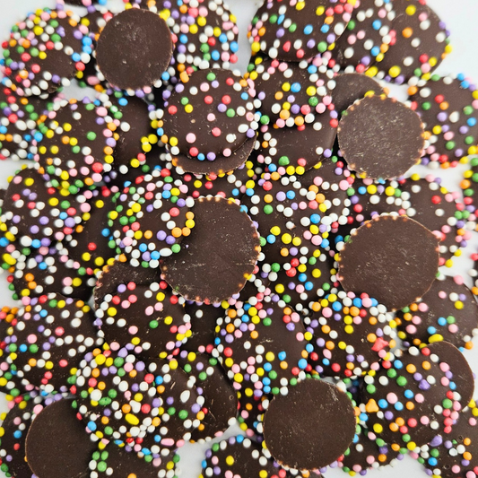50g of our classic milk and white rice milk chocolate with delicious crunchy multicoloured sprinkles free from palm oil, soy, gluten, dairy and packaged in compostable baggies.